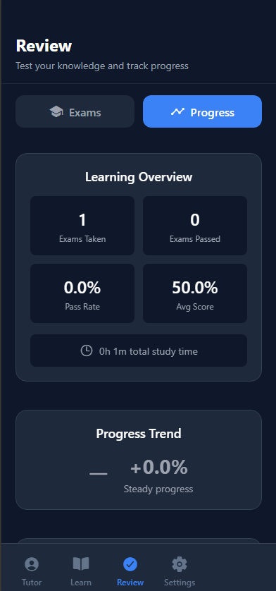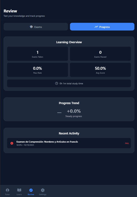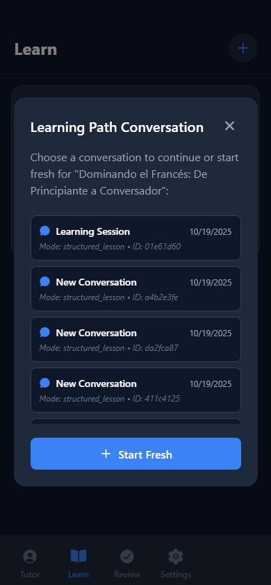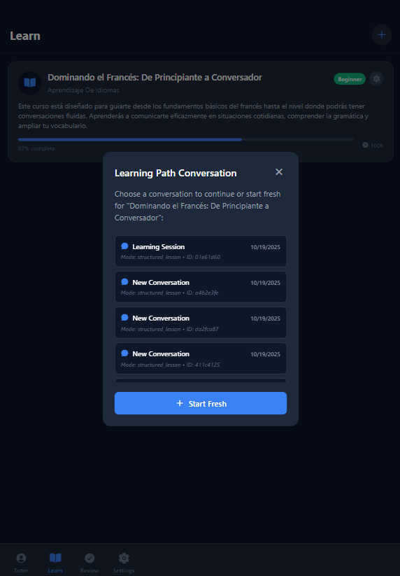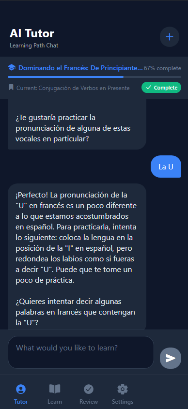 Crea viajes de aprendizaje personalizados adaptados a tus metas, chatea con un tutor IA inteligente y rastrea tu progreso en todas las materias. Desde lecciones estructuradas hasta conversaciones interactivas - todo se adapta a tu estilo de aprendizaje.